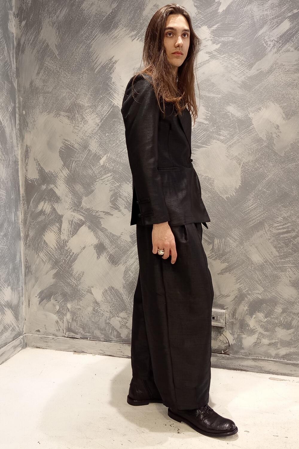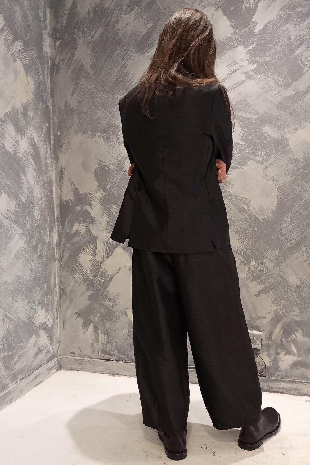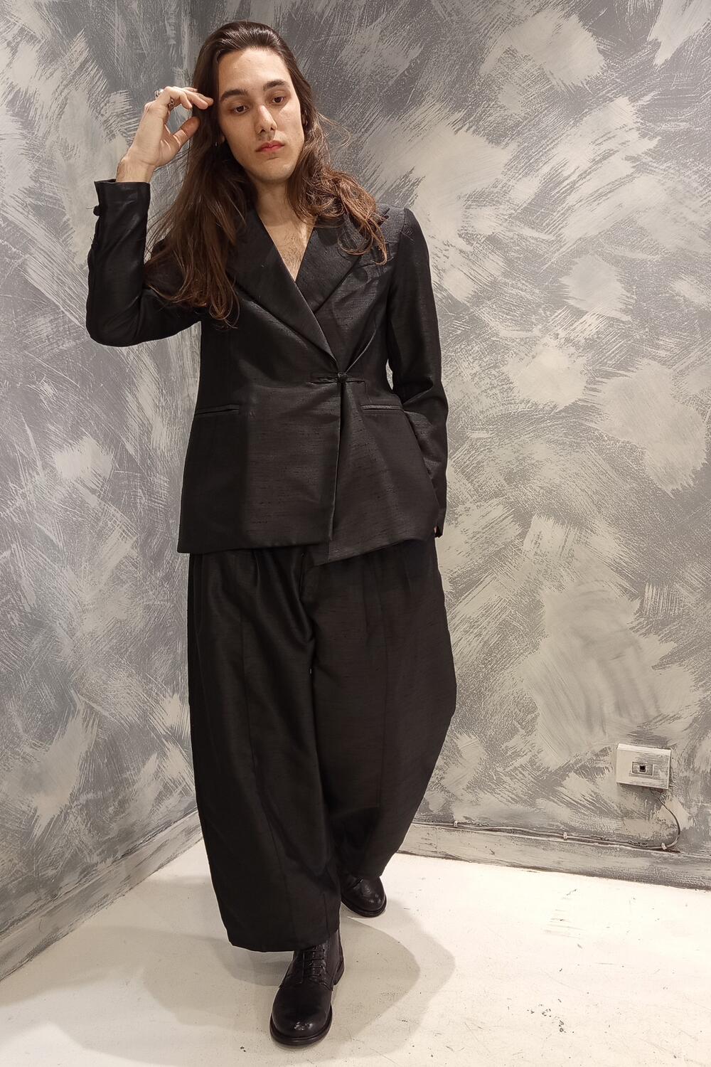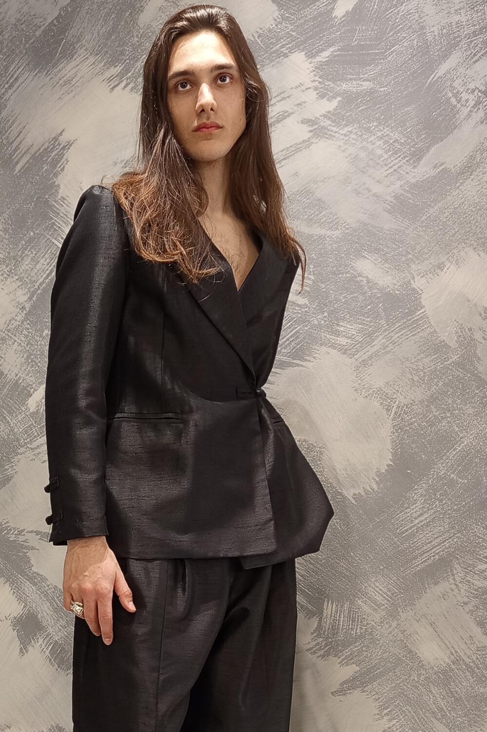 Giacca in Taffetà colore nero con allacciatura laterale. Collo a becche ampie. tasche a filetto taschino interno. doppio spacco posteriore.