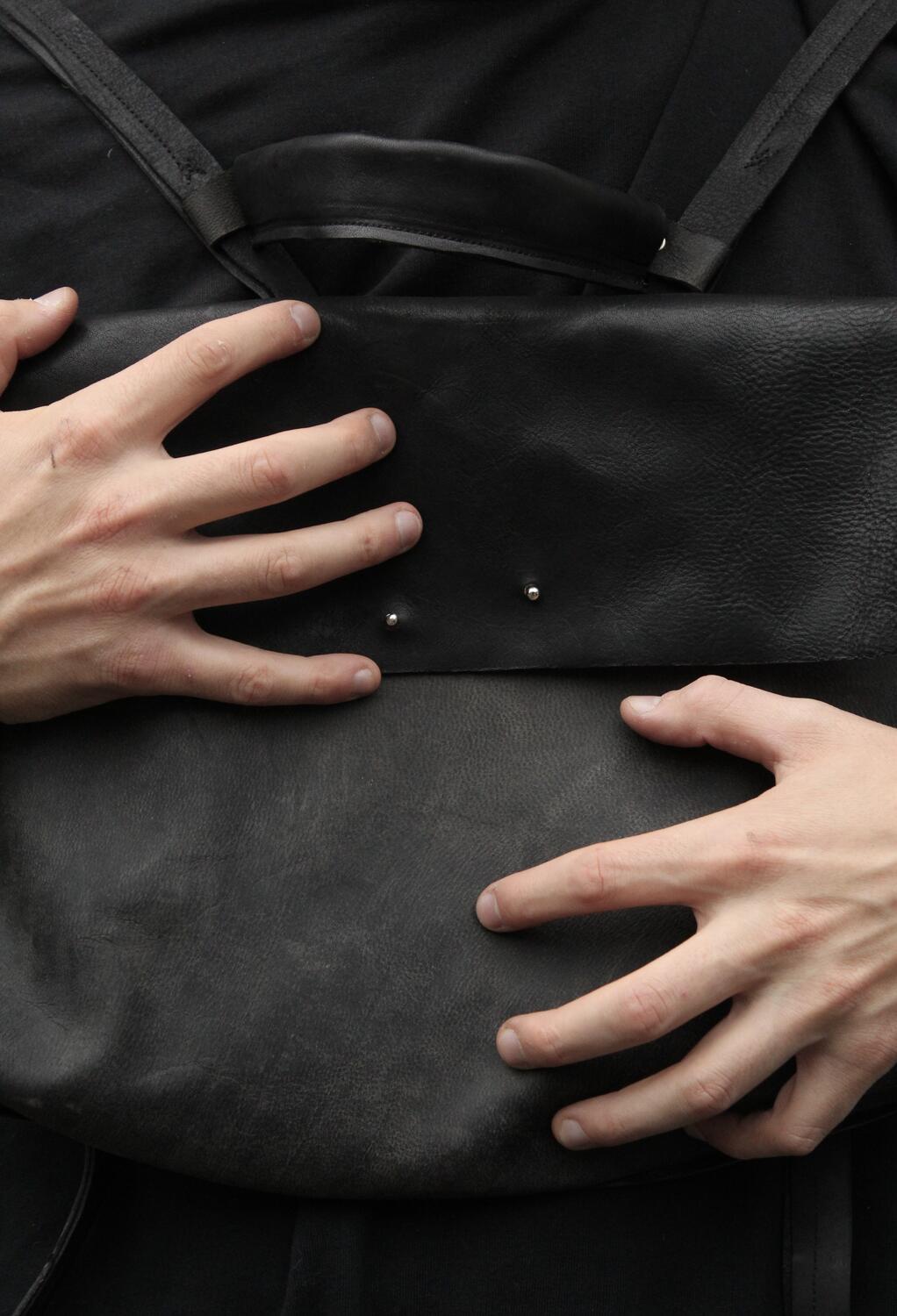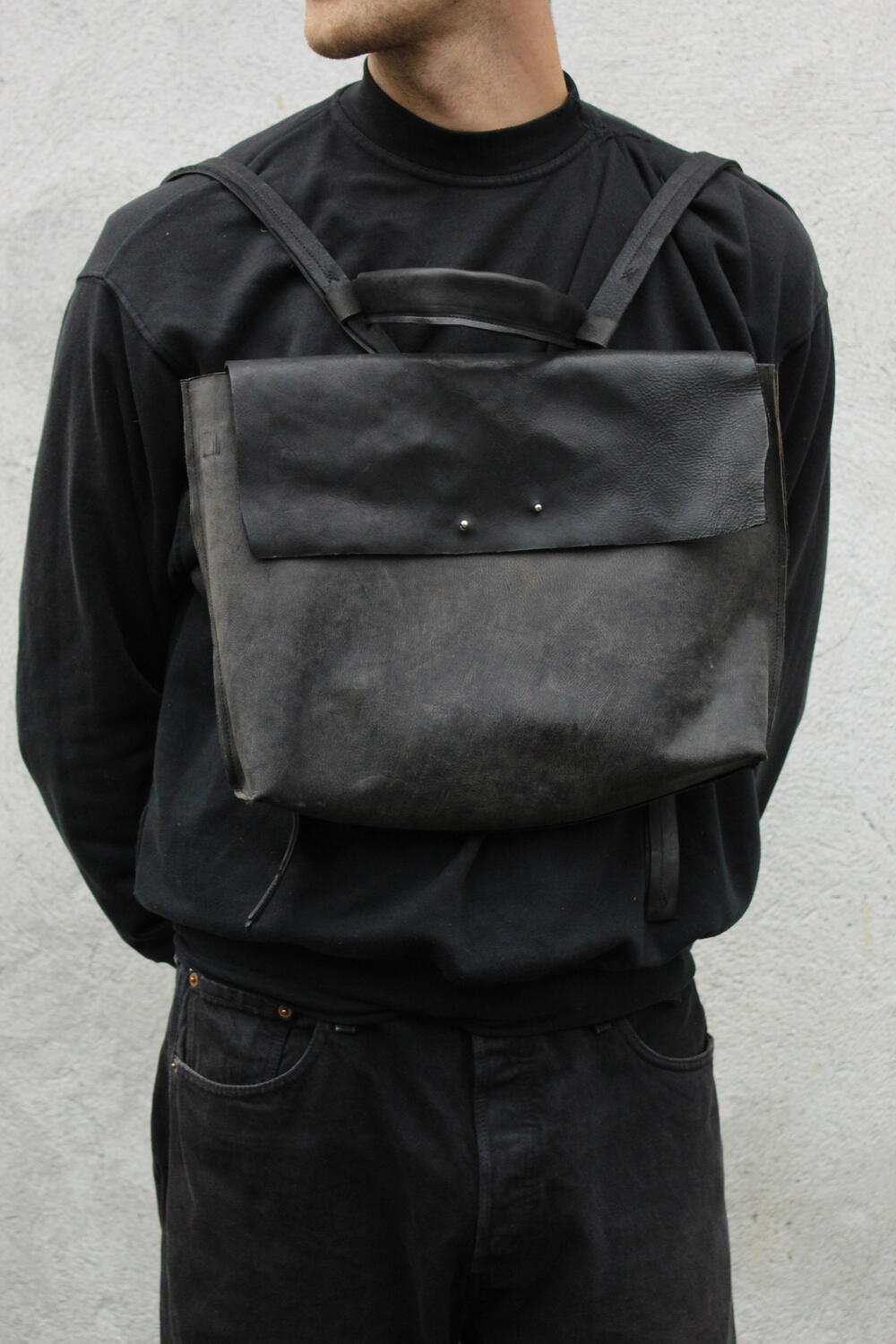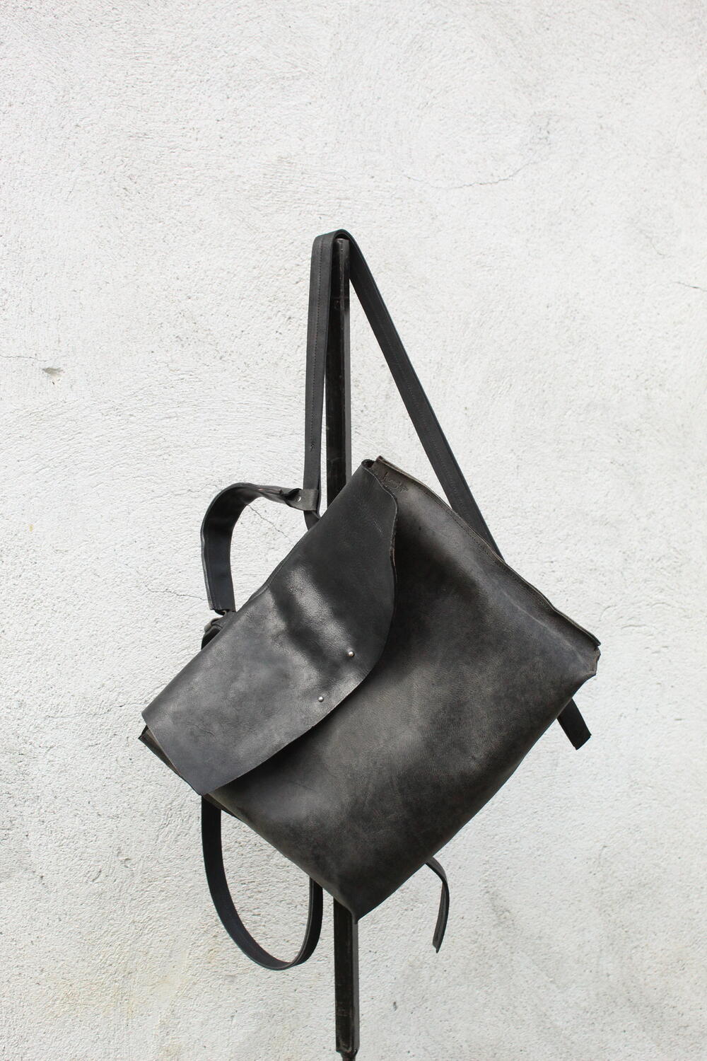 Zaino in pelle sfoderata con concia vegetale, doppio pellame, parte borsa colore antracite, patta, manico e spallacci colore nero. All'interno pochettone con zip portadocumenti, chiusura con bottone, spallacci regolabili, finiture a taglio vivo.