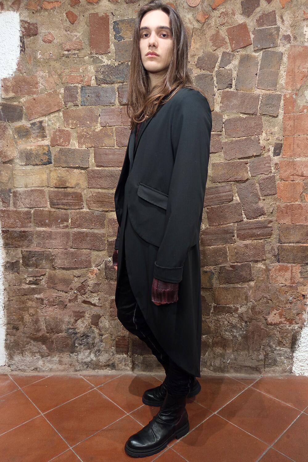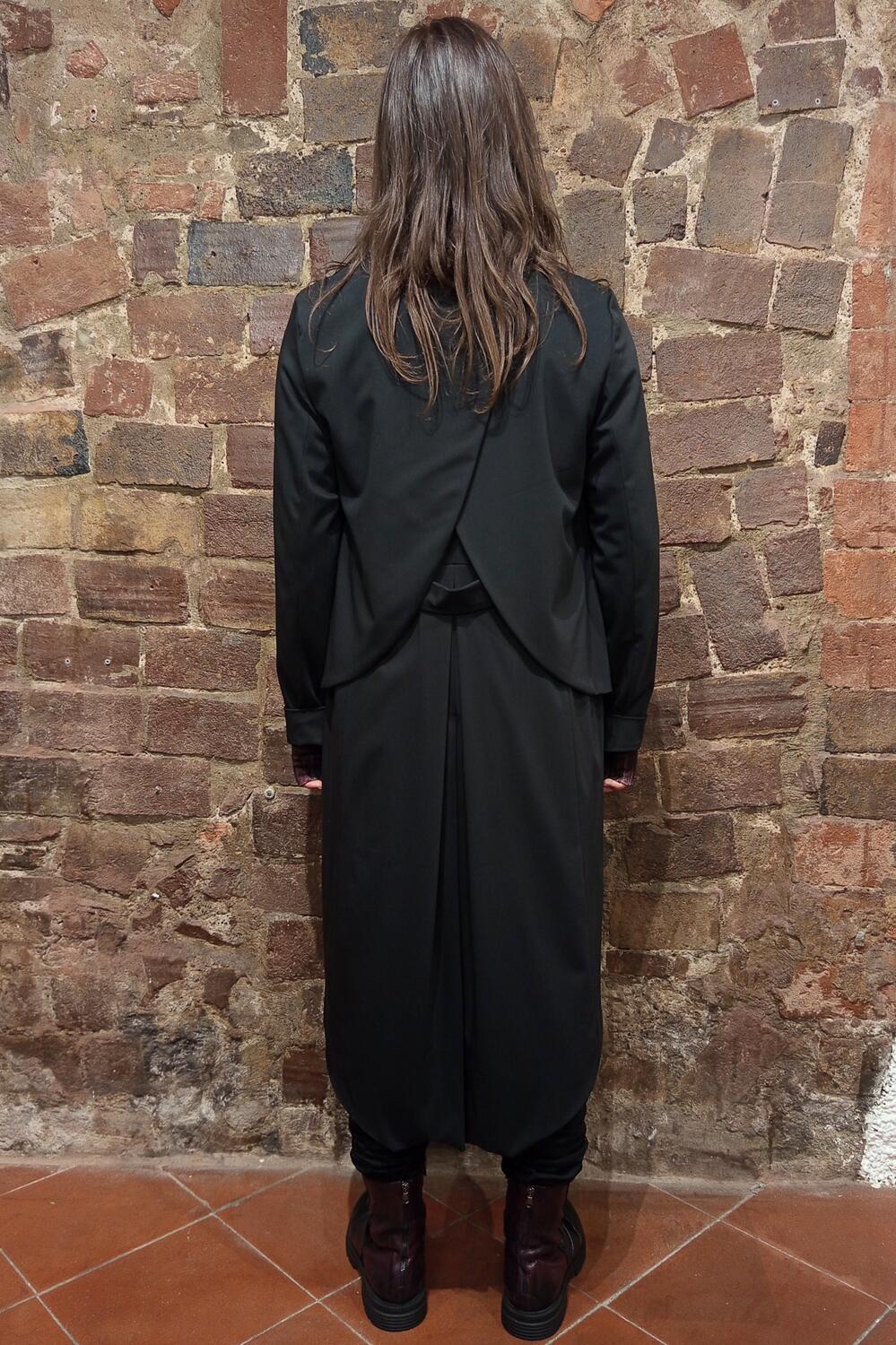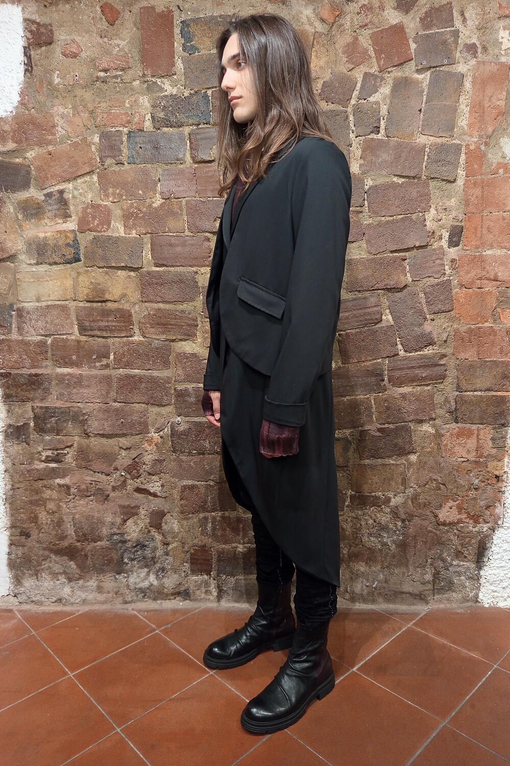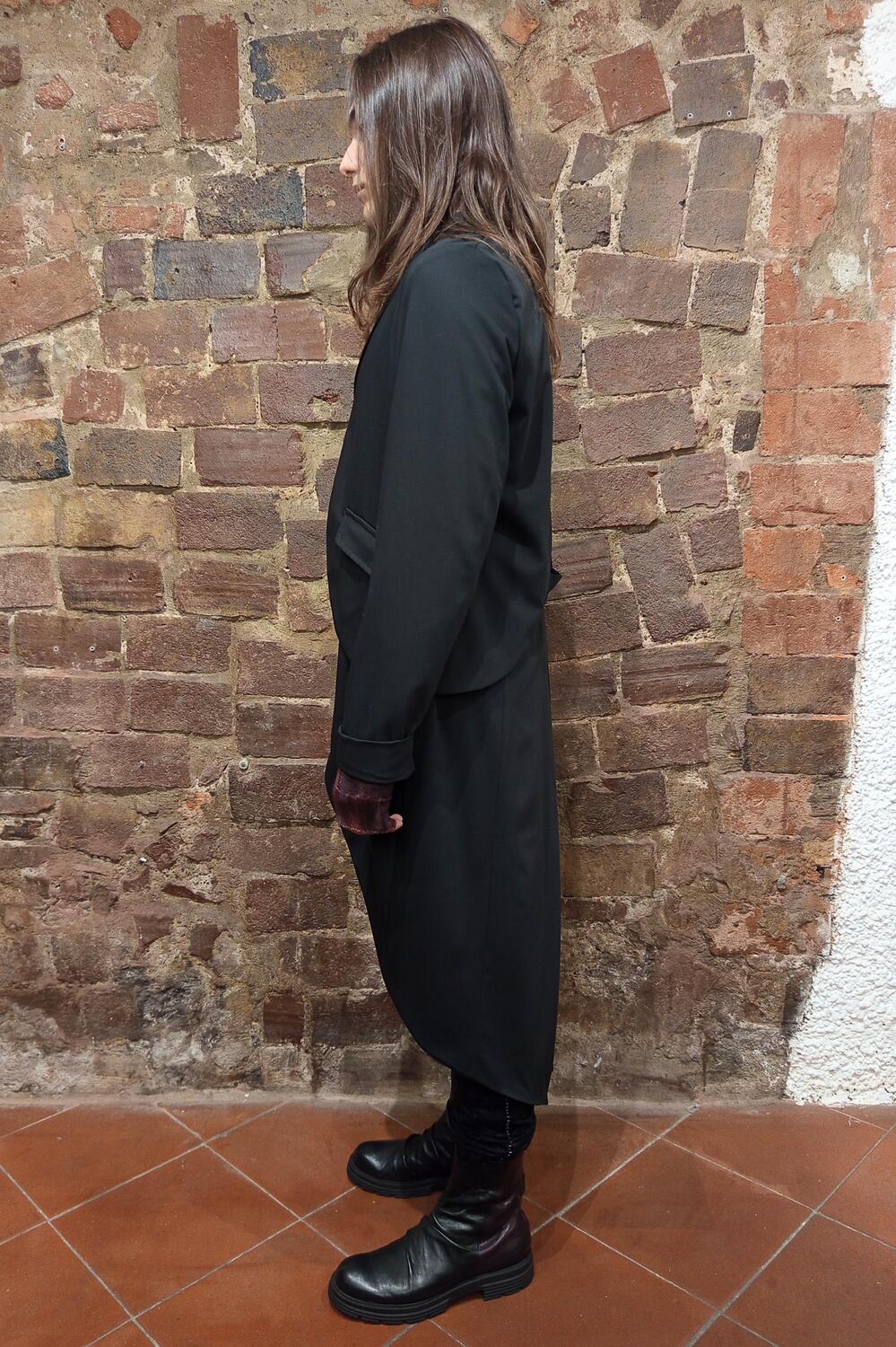 Giacca Frac in tessuto colore nero, con monobottone in metallo, effetto gilet sopra la giacca con doppia taschina con pattina, collo a scialle, code nella parte posteriore con spacco nella parte centrale e martingala.