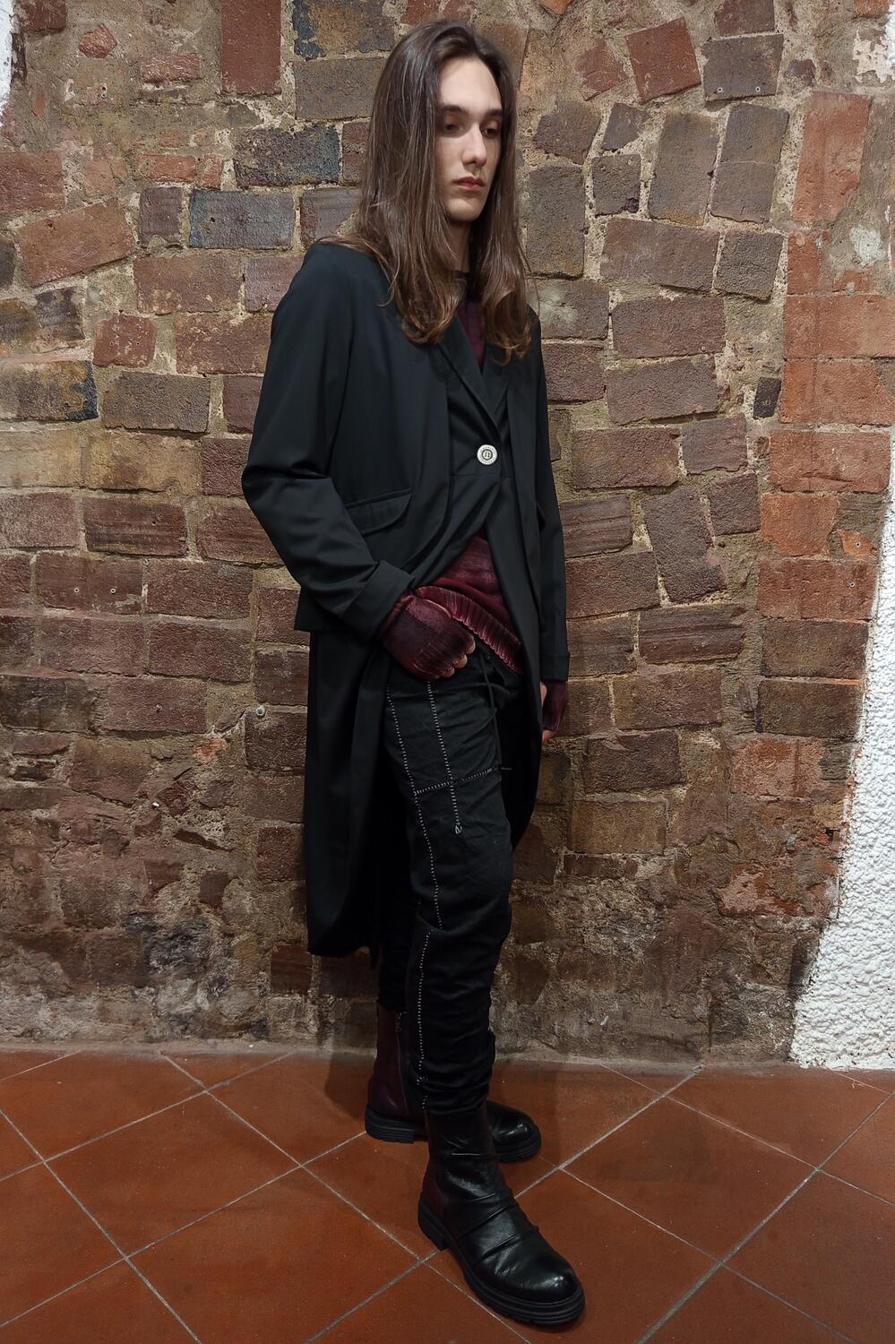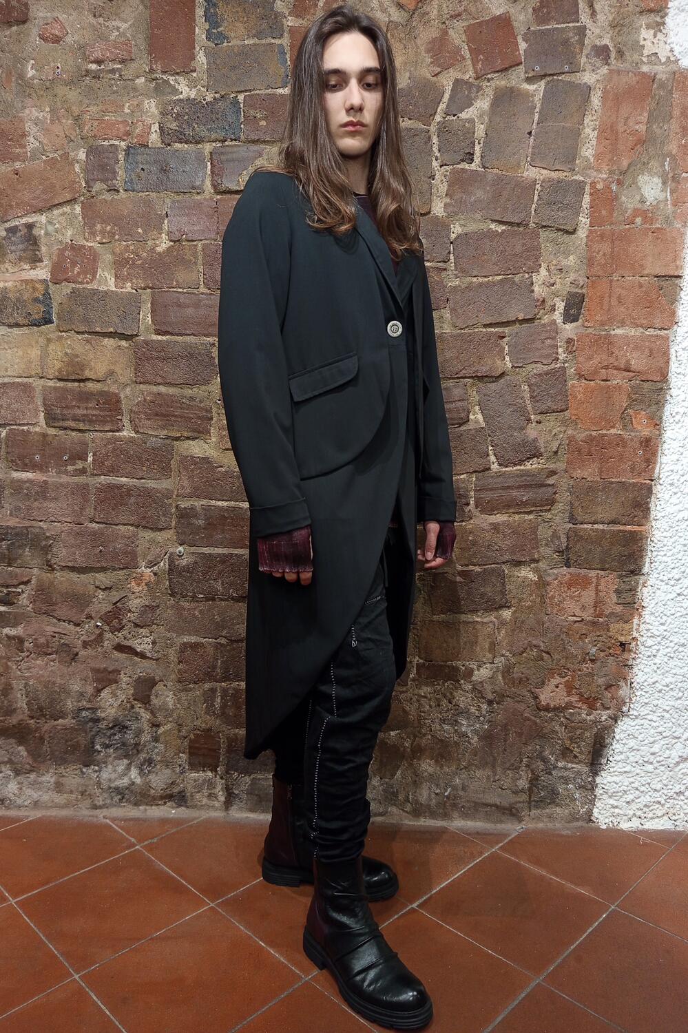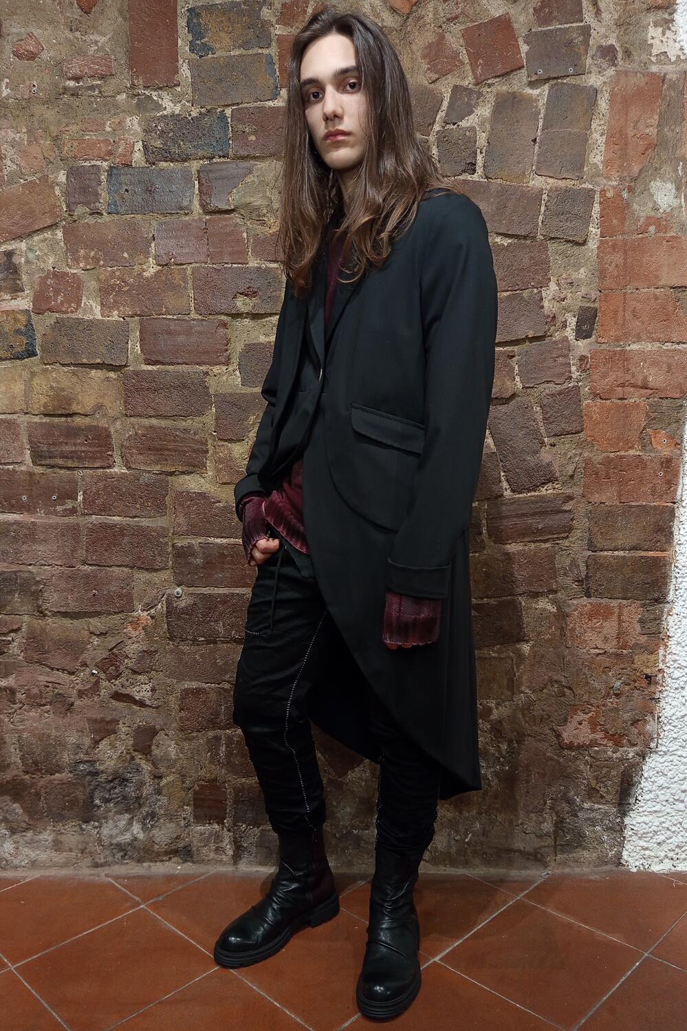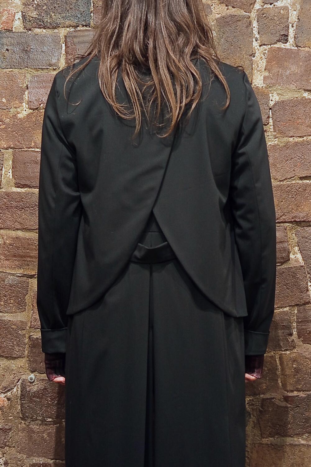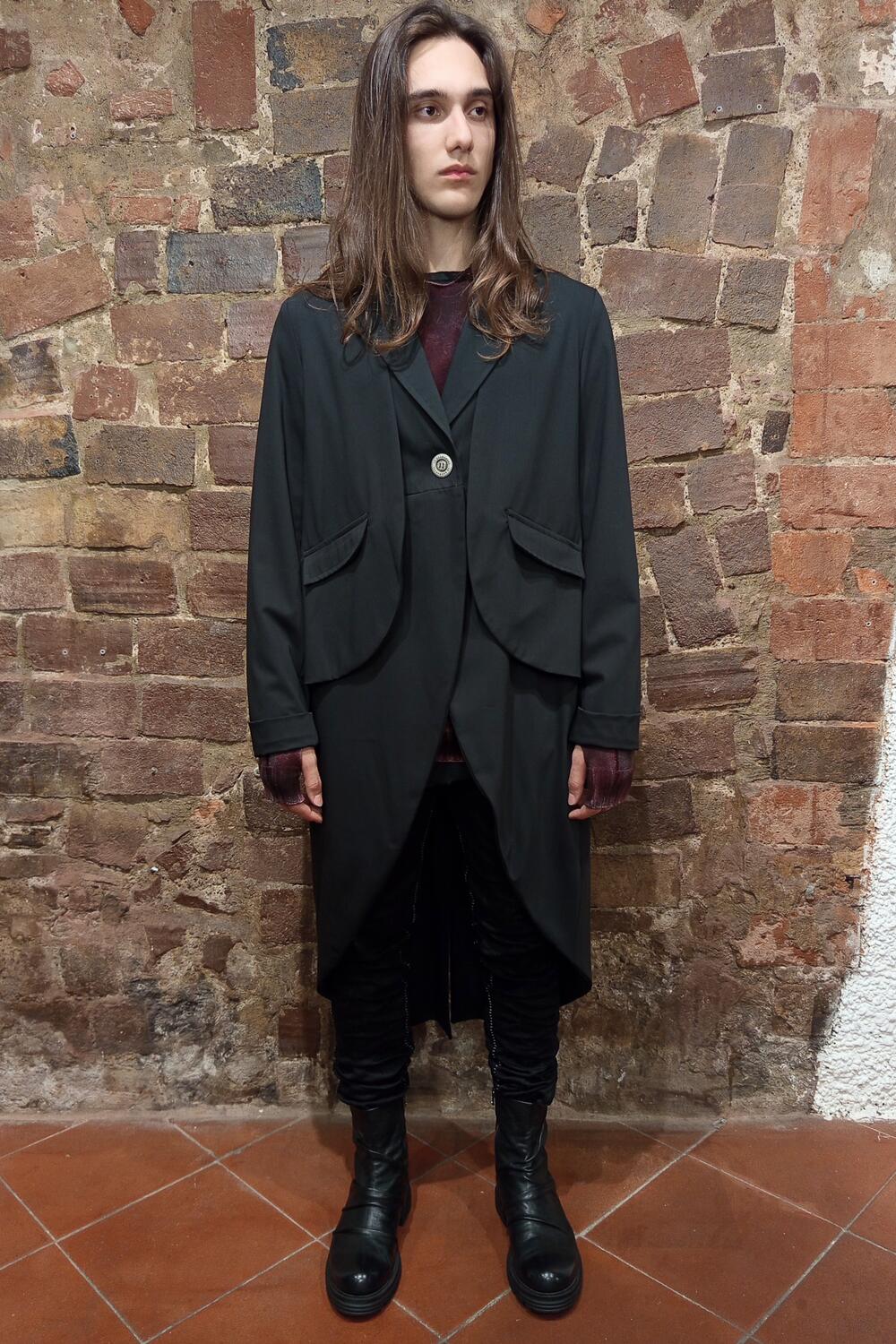 Giacca Frac in tessuto colore nero, con monobottone in metallo, effetto gilet sopra la giacca con doppia taschina con pattina, collo a scialle, code nella parte posteriore con spacco nella parte centrale e martingala.