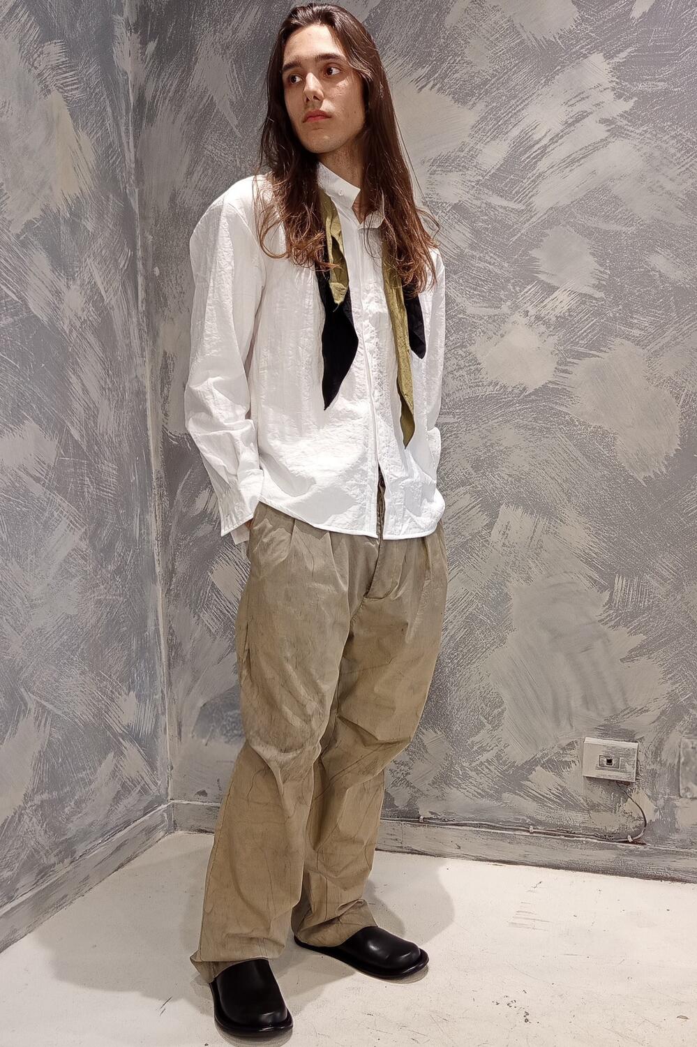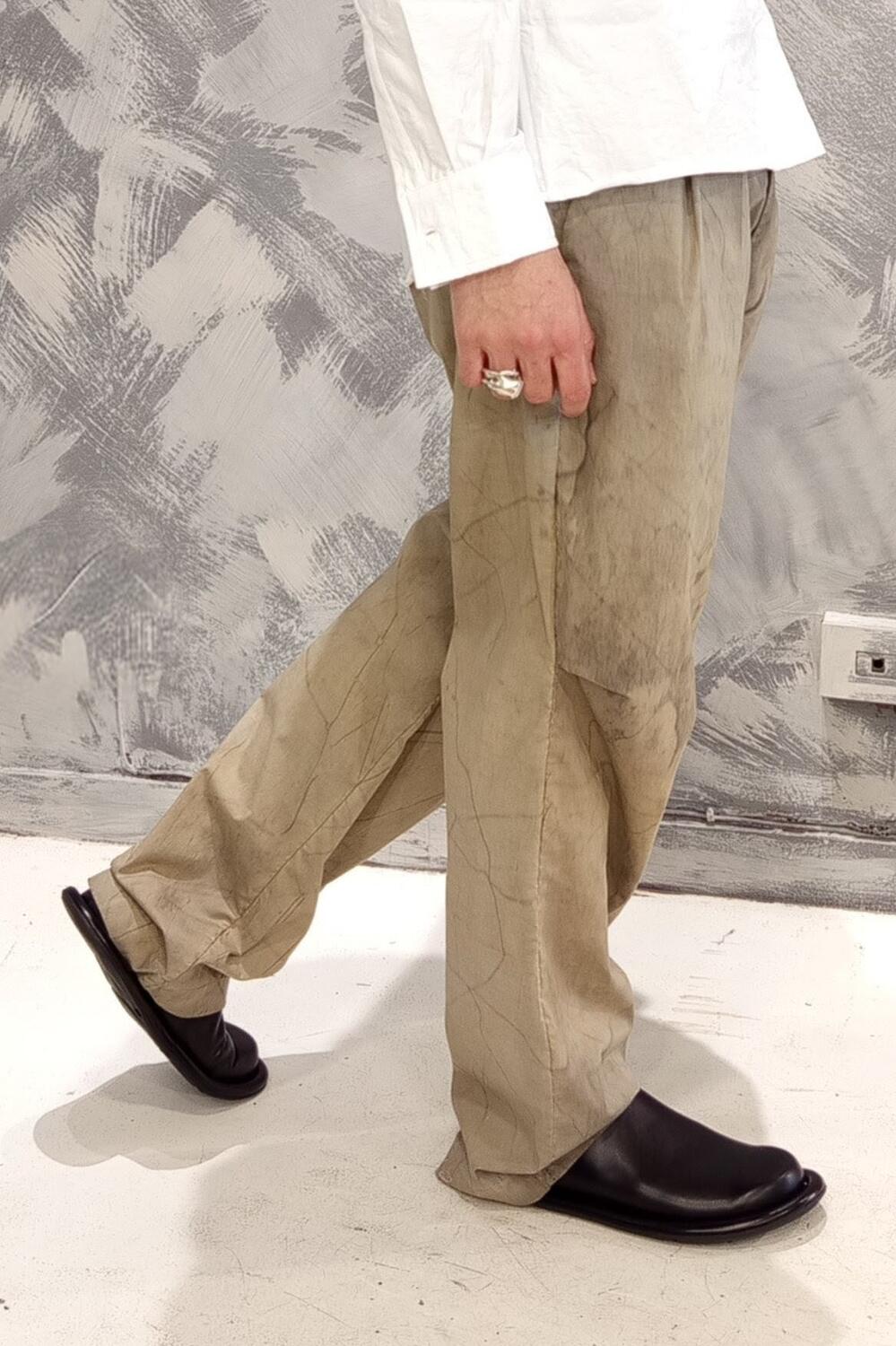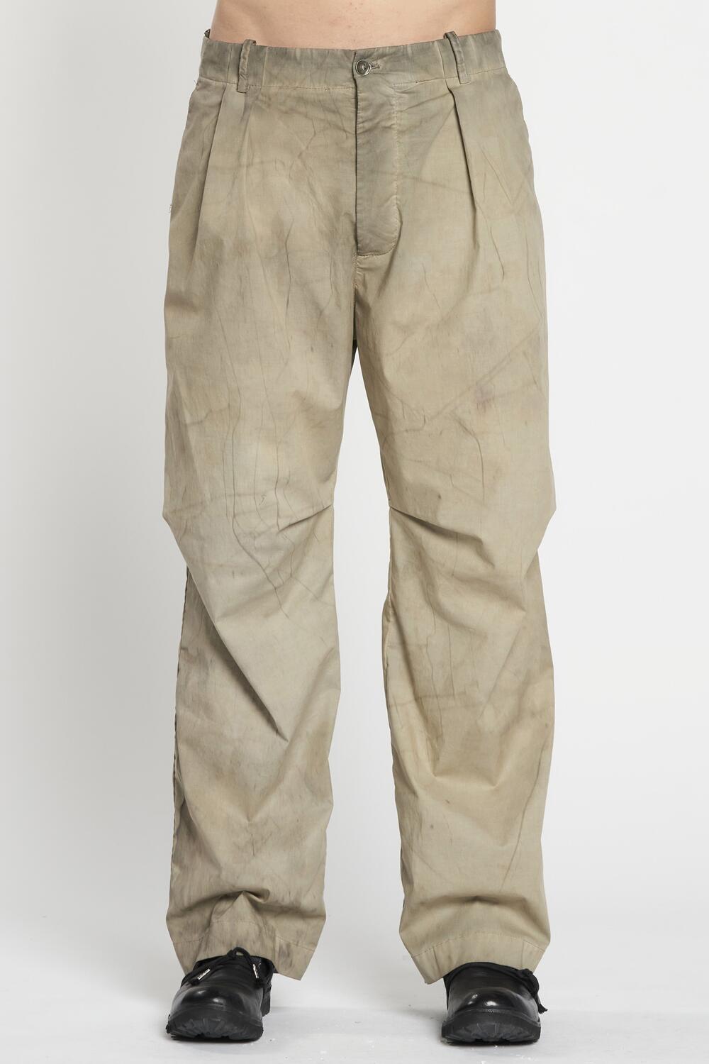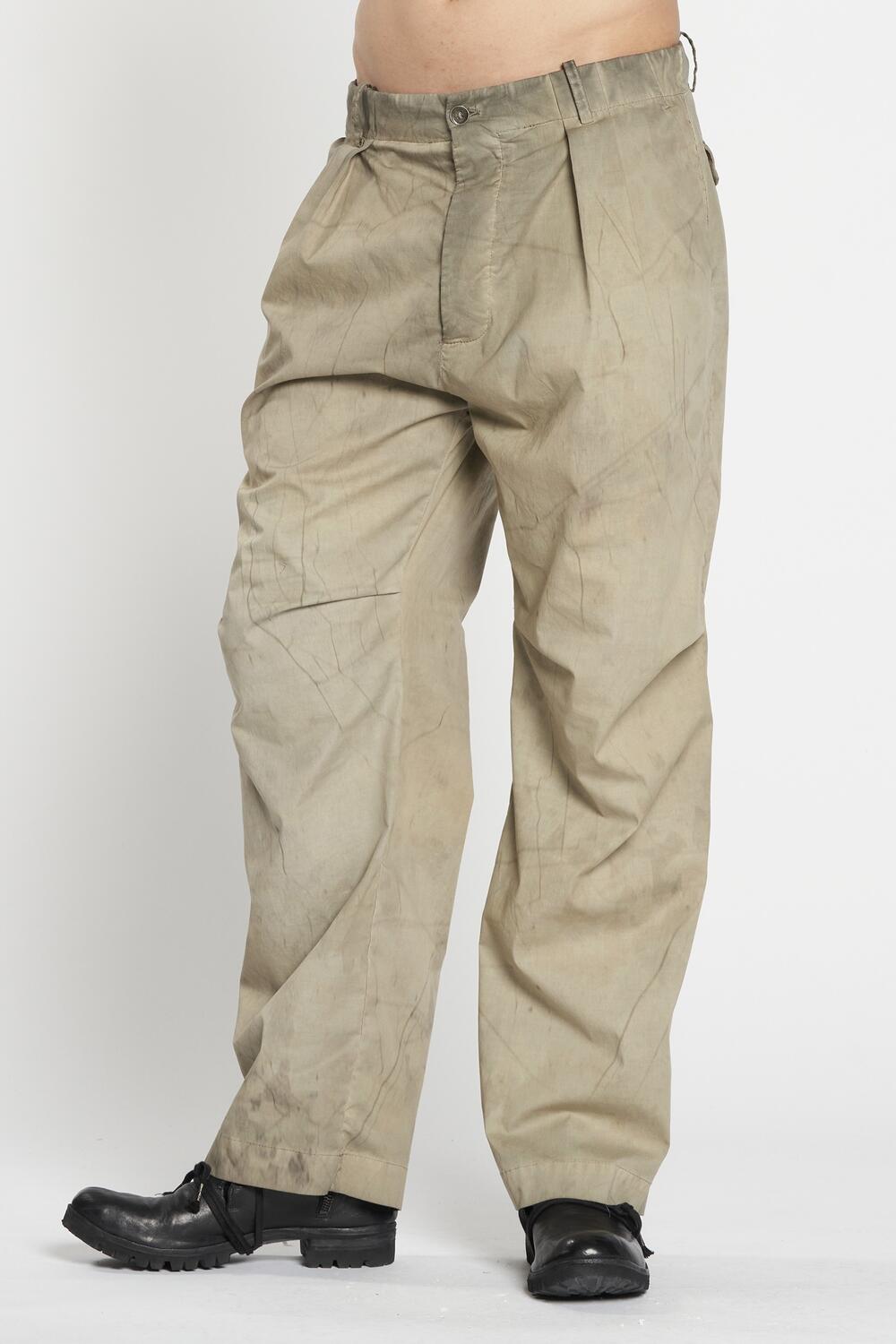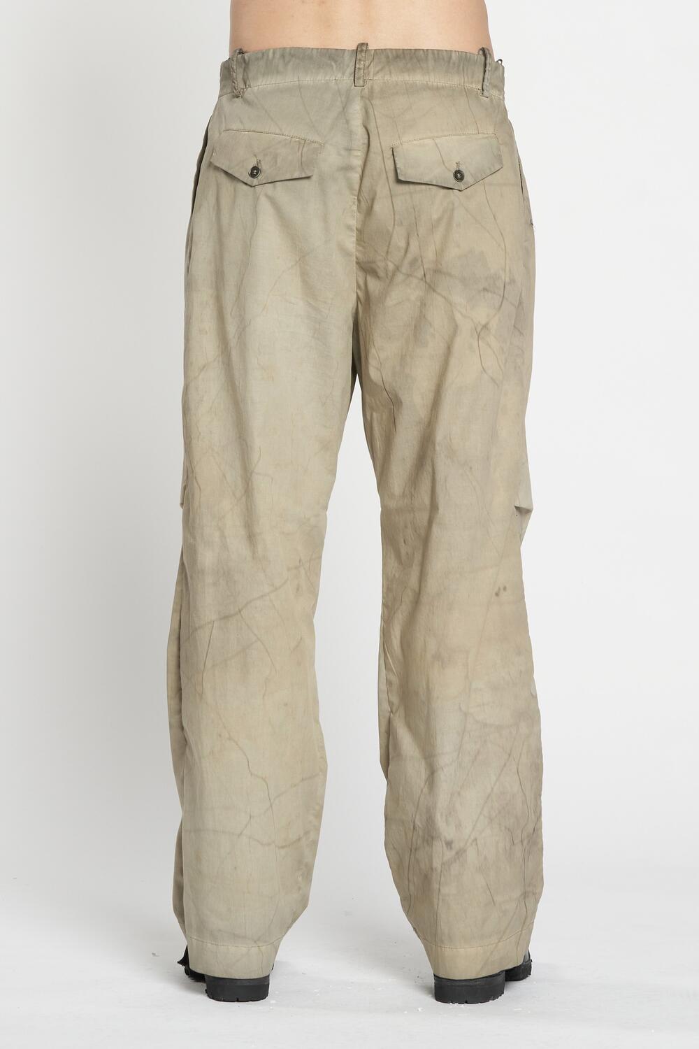 Pantalone colore Military con pence. Stampa esclusiva effetto sporcatura. Chiusura con bottoni in metallo nikel free. Tasche anteriori america e posteriori con patta e bottone di chiusura. gamba morbida e fondo largo.