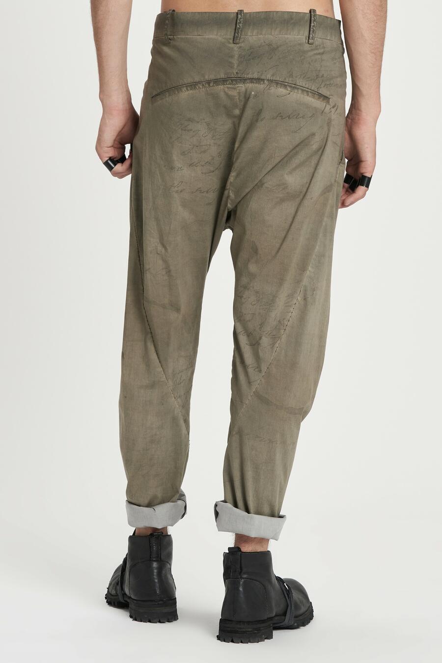 Pantalone cavallo sceso con pences, color Military washed, tessuto con scritte velate, lavaggio e tinture stone. Tasche anteriori e posteriori a filetto. Cuciture a ricamo.