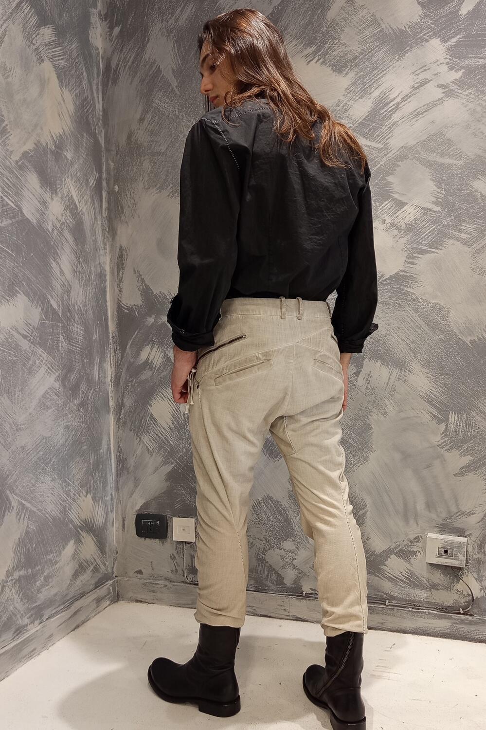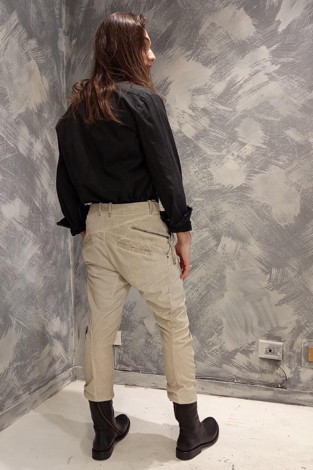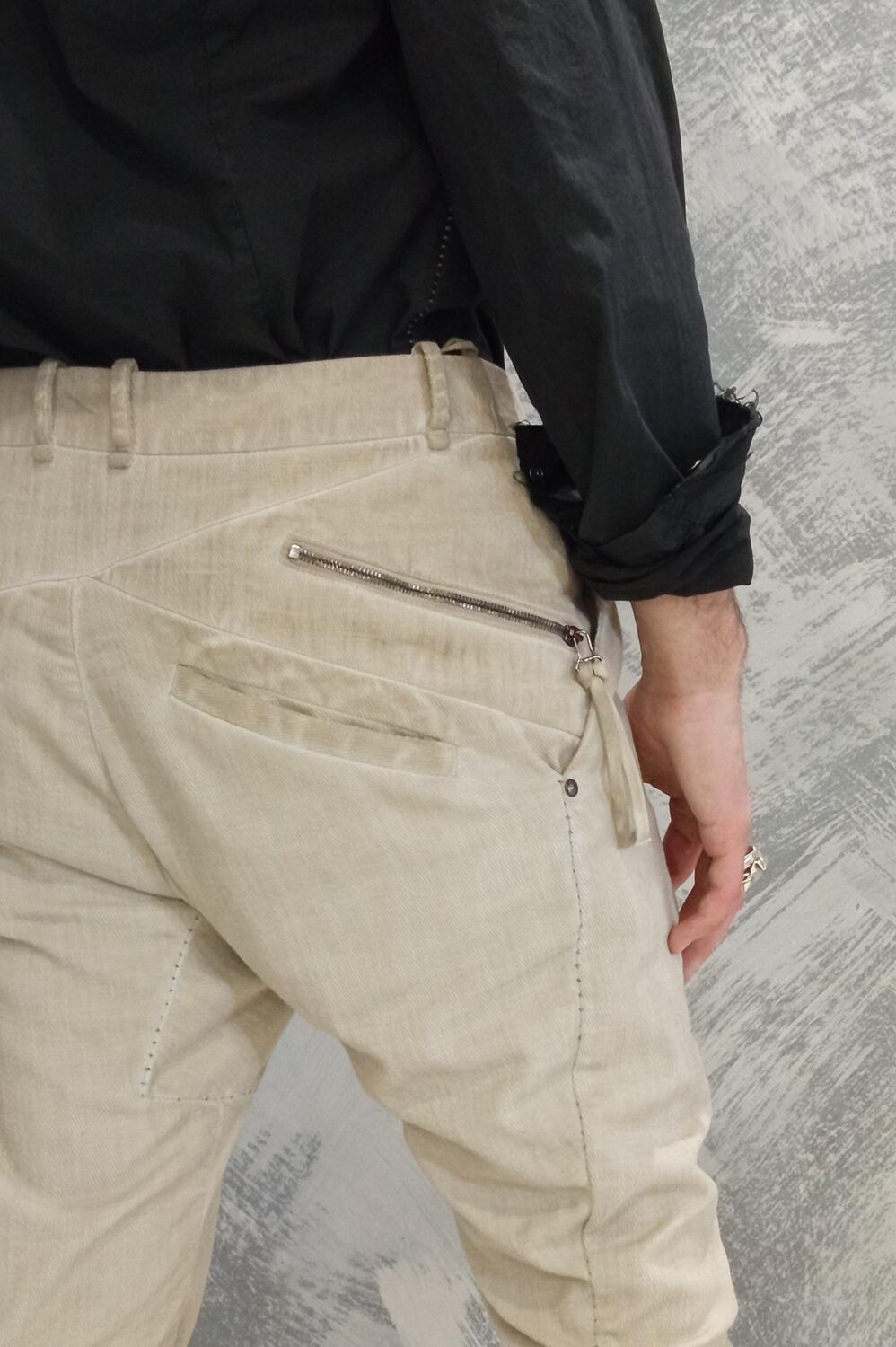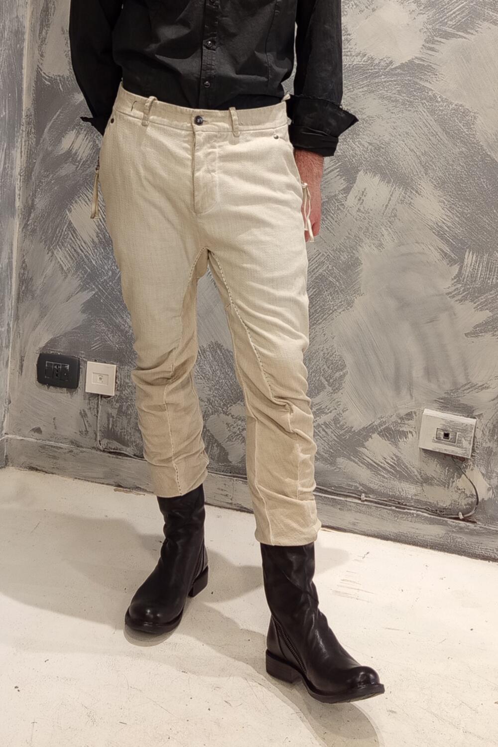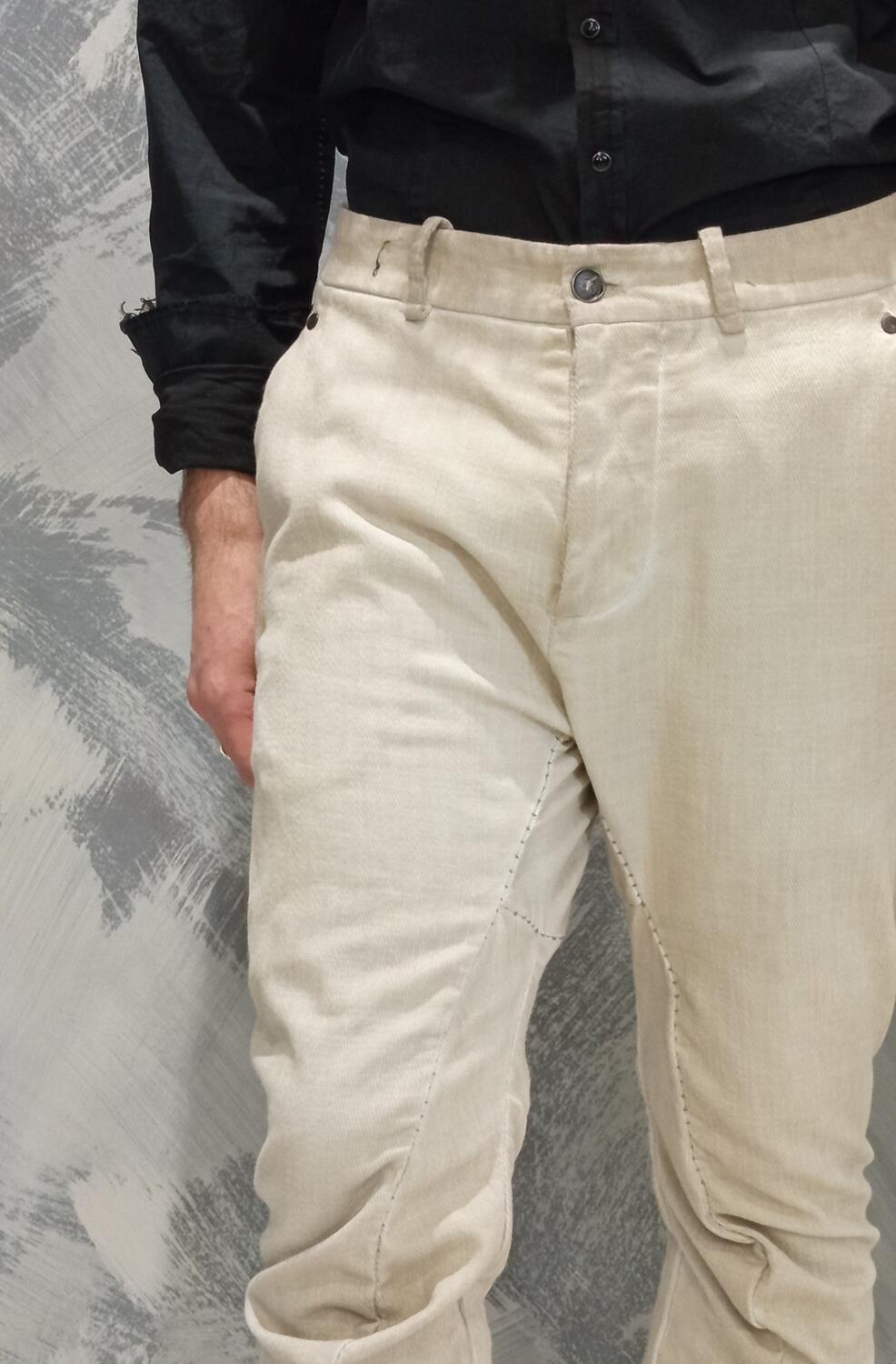 Pantalone colore beige maltinto, tasca america anteriore tasche diagonali posteriori con cerniera e tasche a filetto. cucitura ricamo. bottoni in metallo nichel-free. Fondo con finitura tagliovivo.