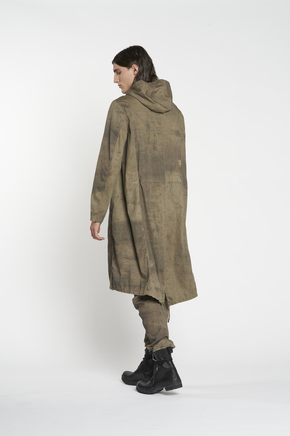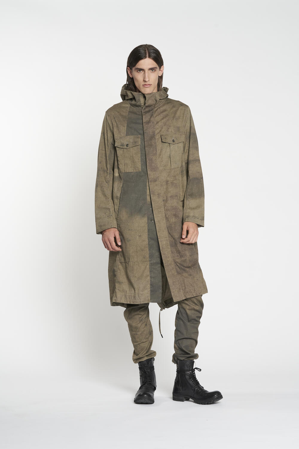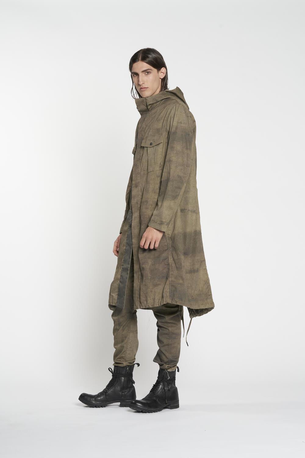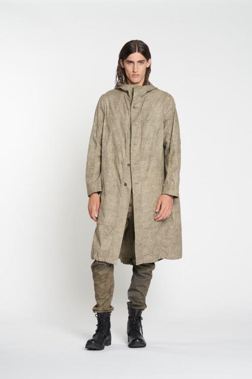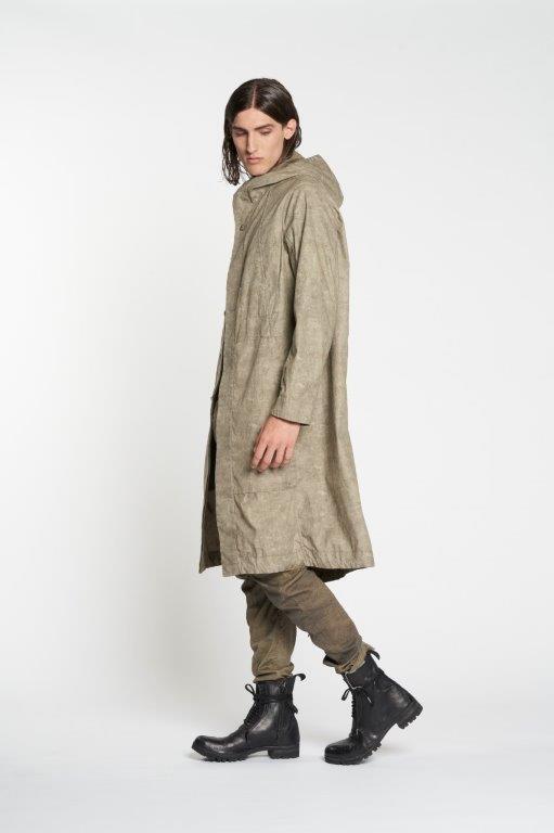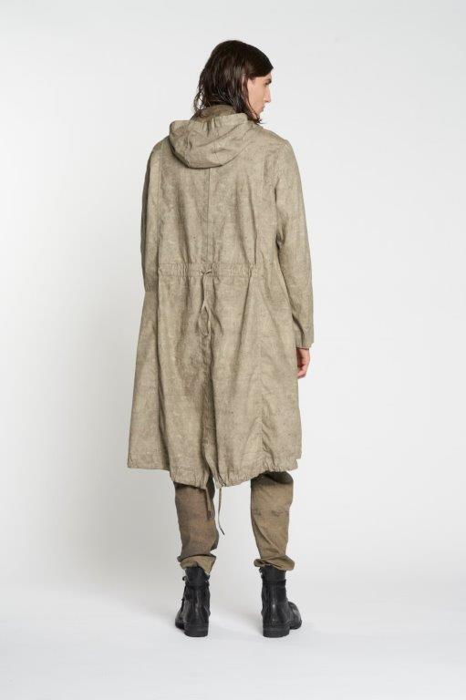 Parka reversibile con cappuccio in morbido tessuto con stampe esclusive nelle due versioni. Versione uno più scura con tasche a scomparsa a filetto e tasche applicate con patta e bottone sul petto con coulisse e spacco posteriore. Versione due chiara con ampie tasche applicate coulisse a vista e spacco posteriore. chiusura con bottoni in metallo nichel free.