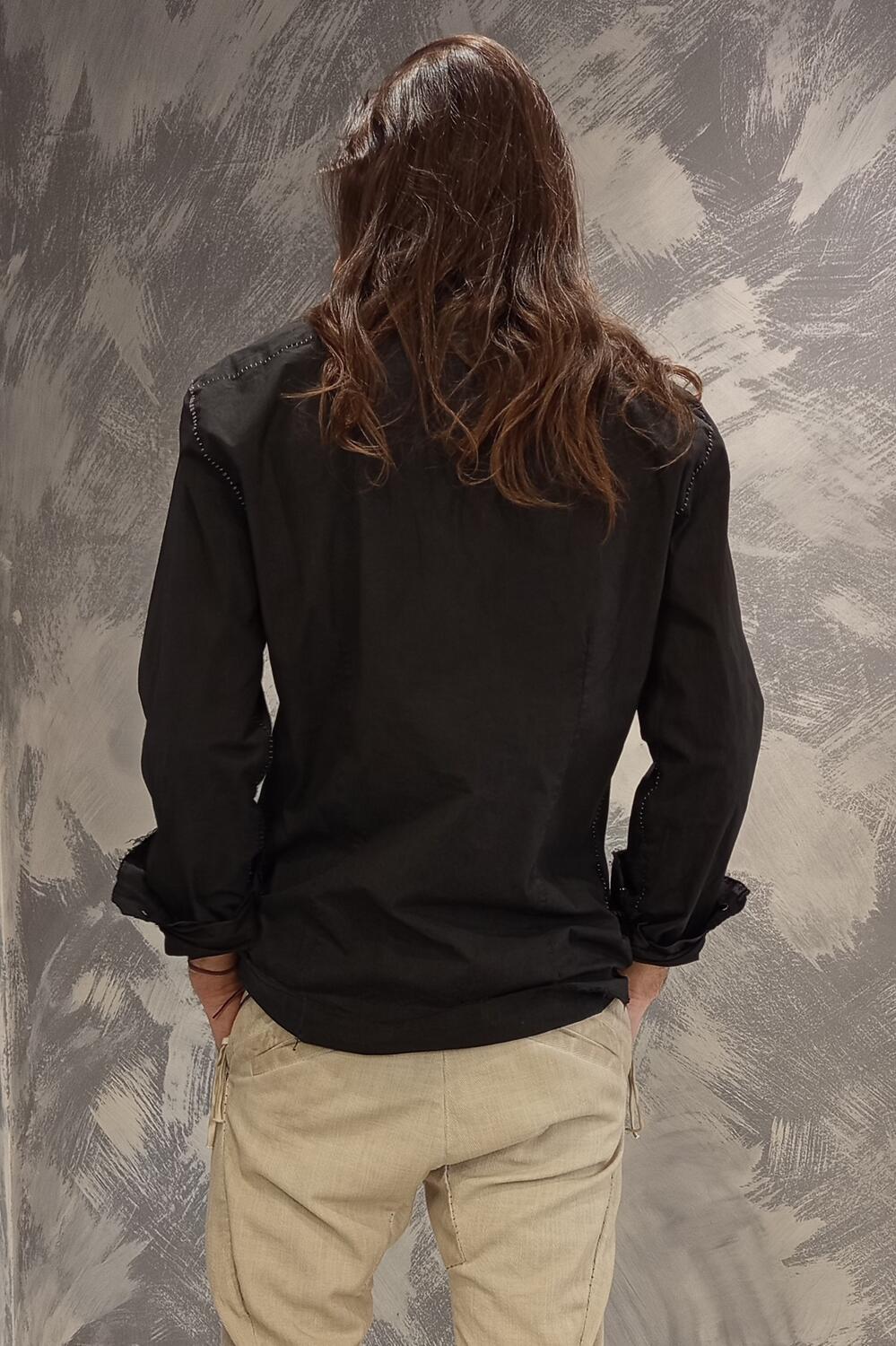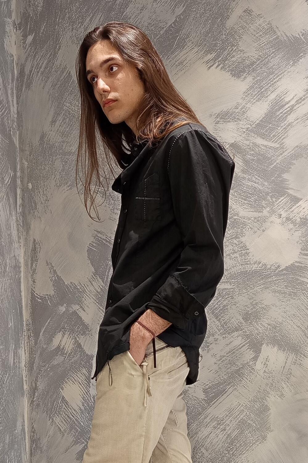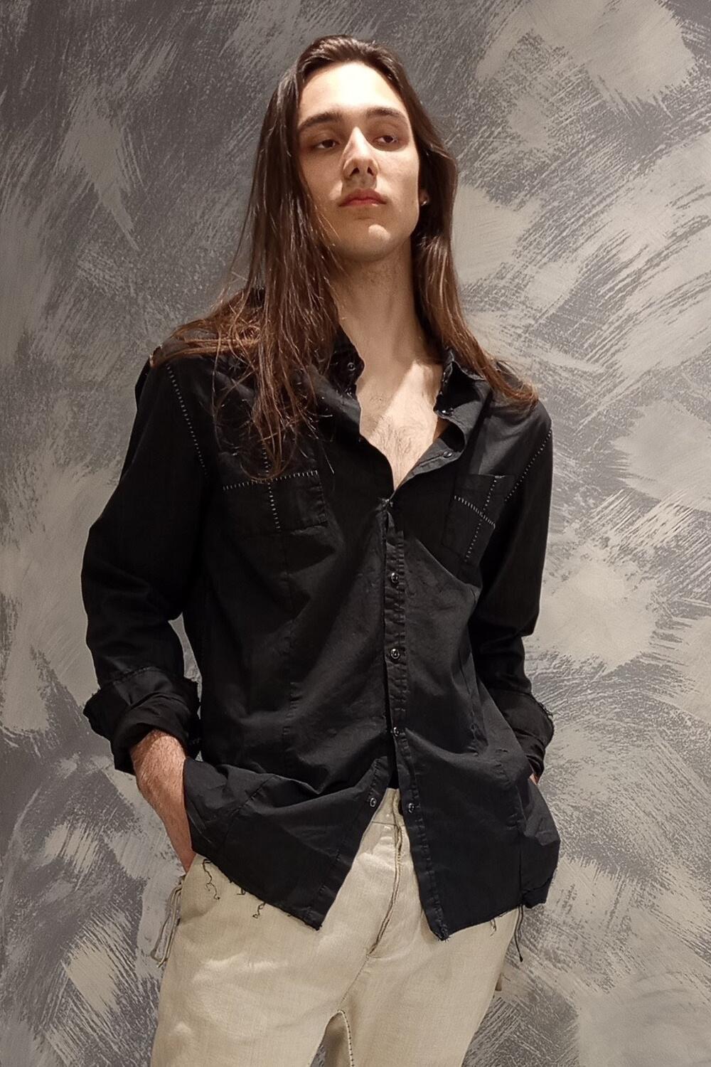 Camicia colore nero con tessuto lavato, bottoni a clip in madreperla nero.Collo a becche e taschini applicati. cuciturericamo e finiture a taglio vivo.