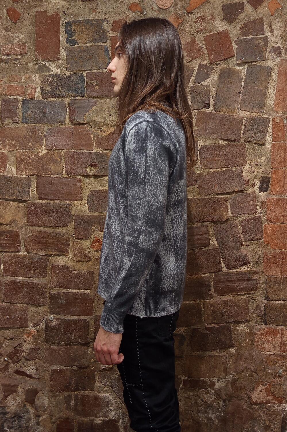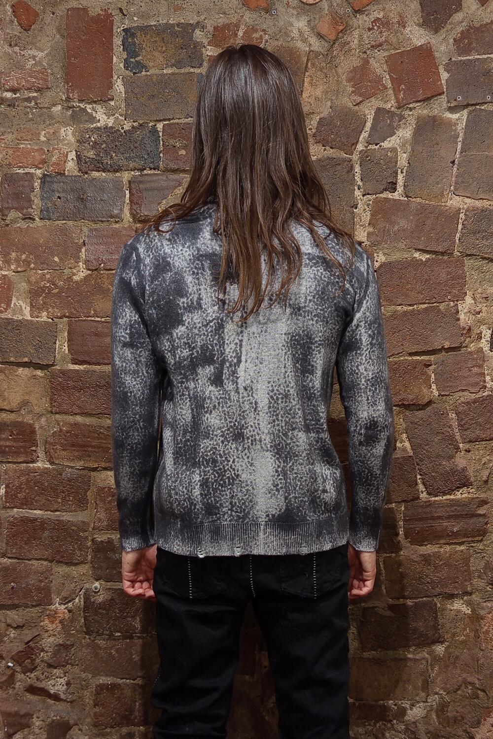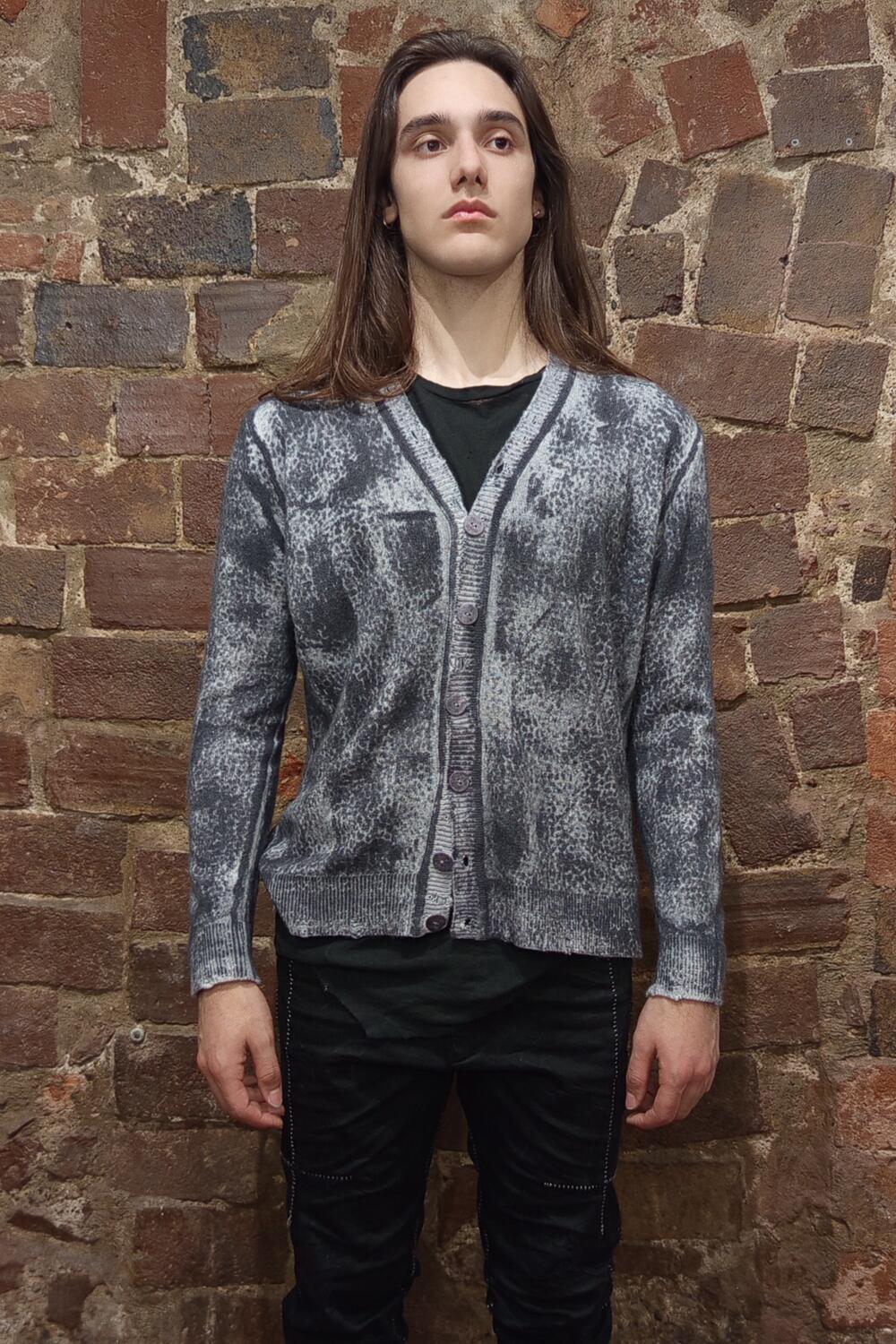 Cardigan dipinto a mano con trattamento a rullo, colore grigio sfumato, con microrotture su collo, polsi e fondo, vestibilità slim.
