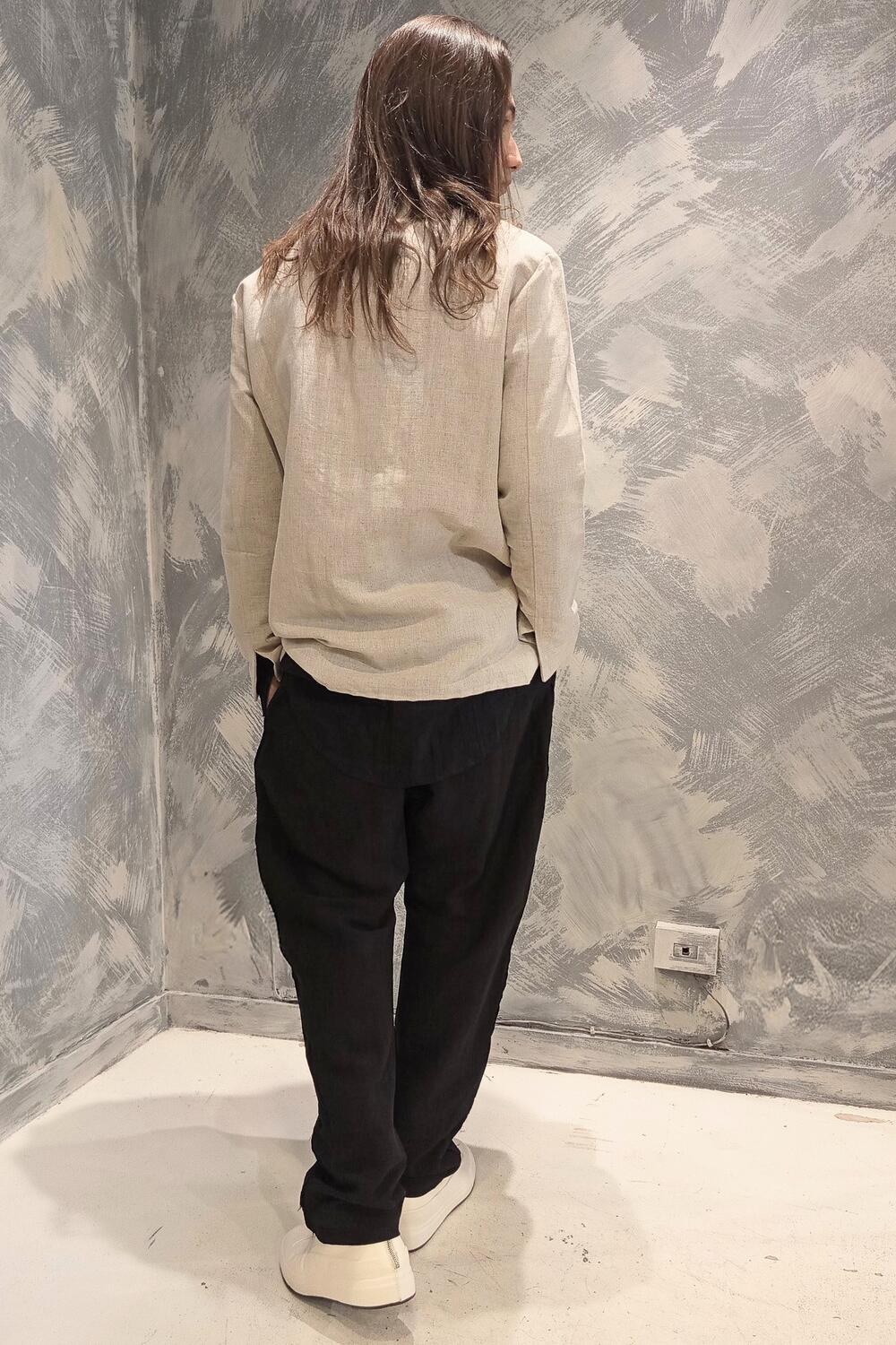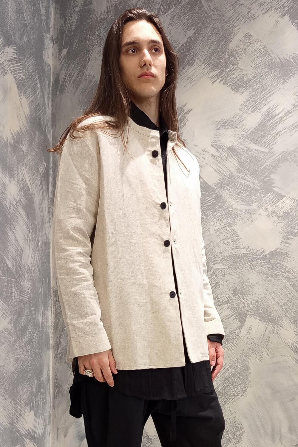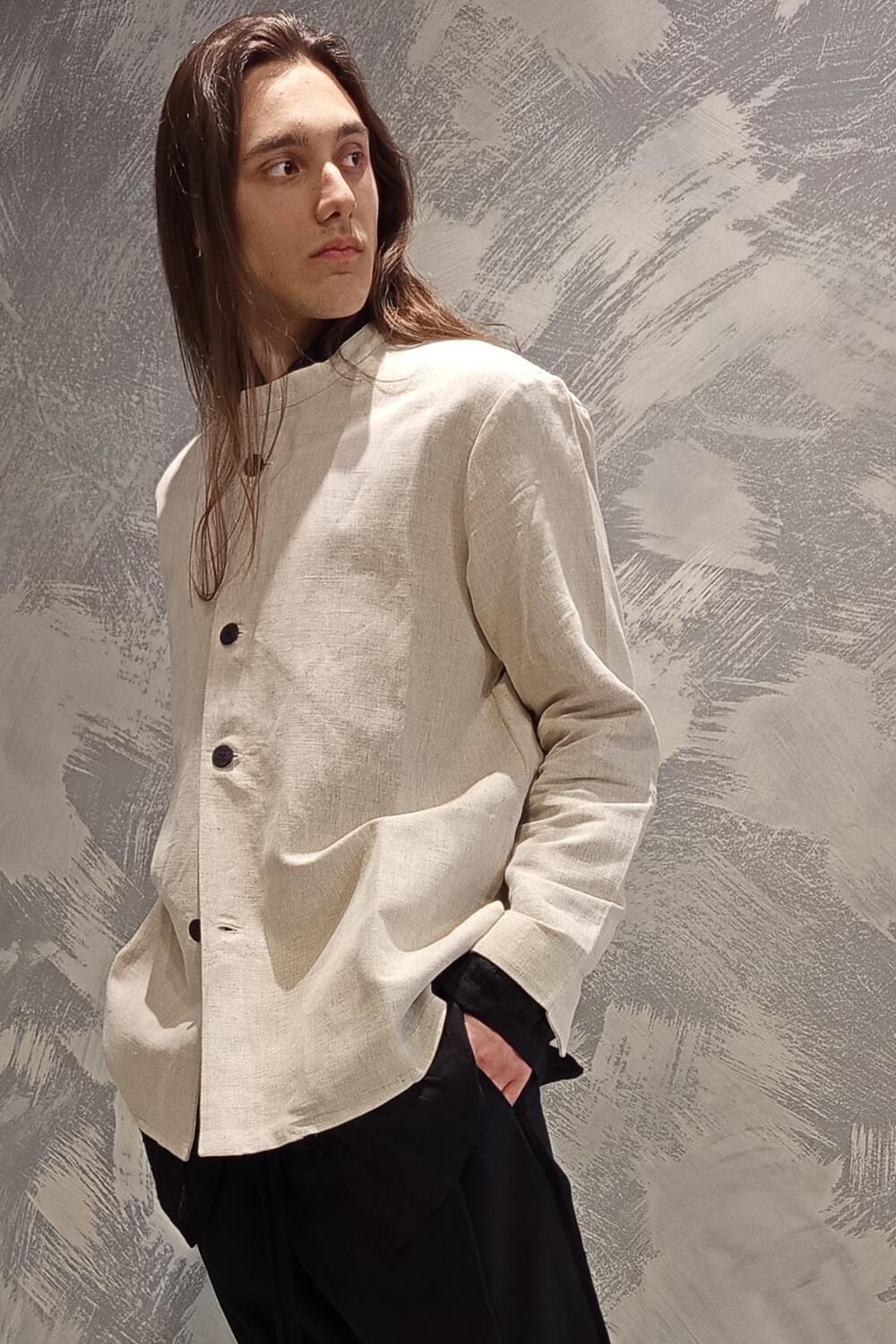Giacca Tessuto Colore Beige. Bottoni a contrasto neri. spacco laterale stondato sul davanti e spacco sul polso. tasche a scomparsa e collo alla coreana.