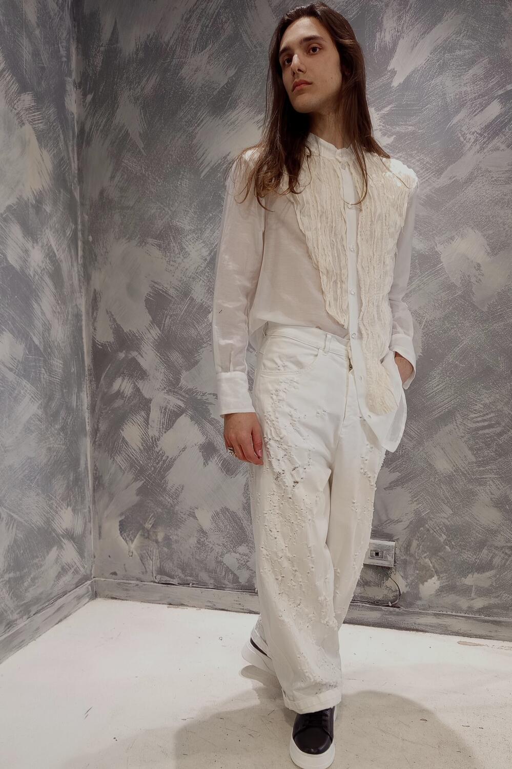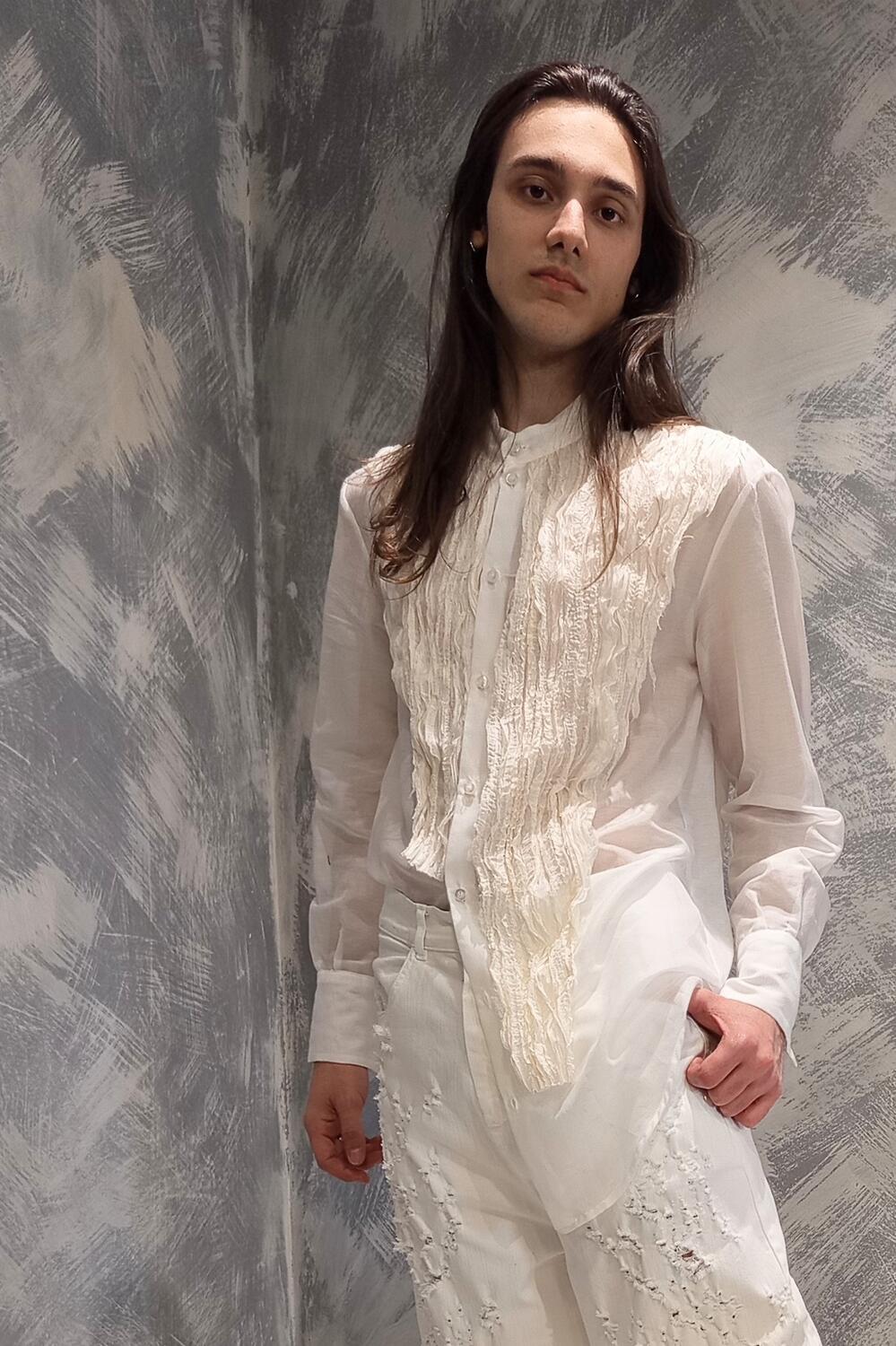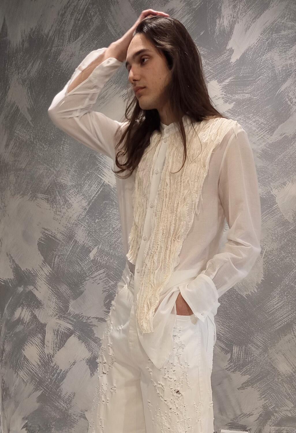 Camicia in morbida Mussola colore Bianco con plastron asimmetrico a contrasto color burro. polso con doppio bottone e collo alla coreana.