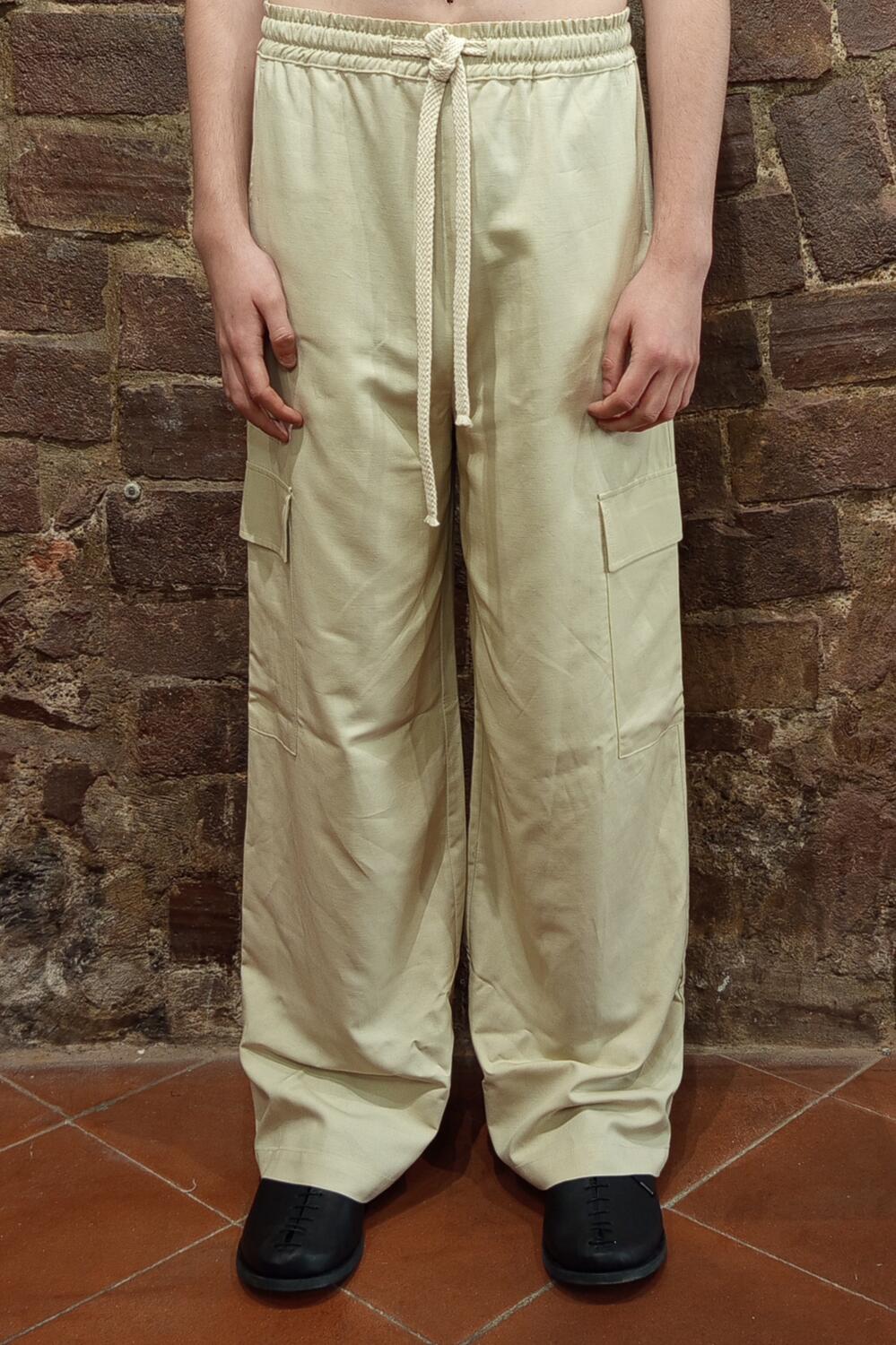 Pantalone cargo colore beige, con elastico e coulisse in vita, tasconi laterali, tasche america e tasche posteriori a filetto. Fondo cm 30 (circa)