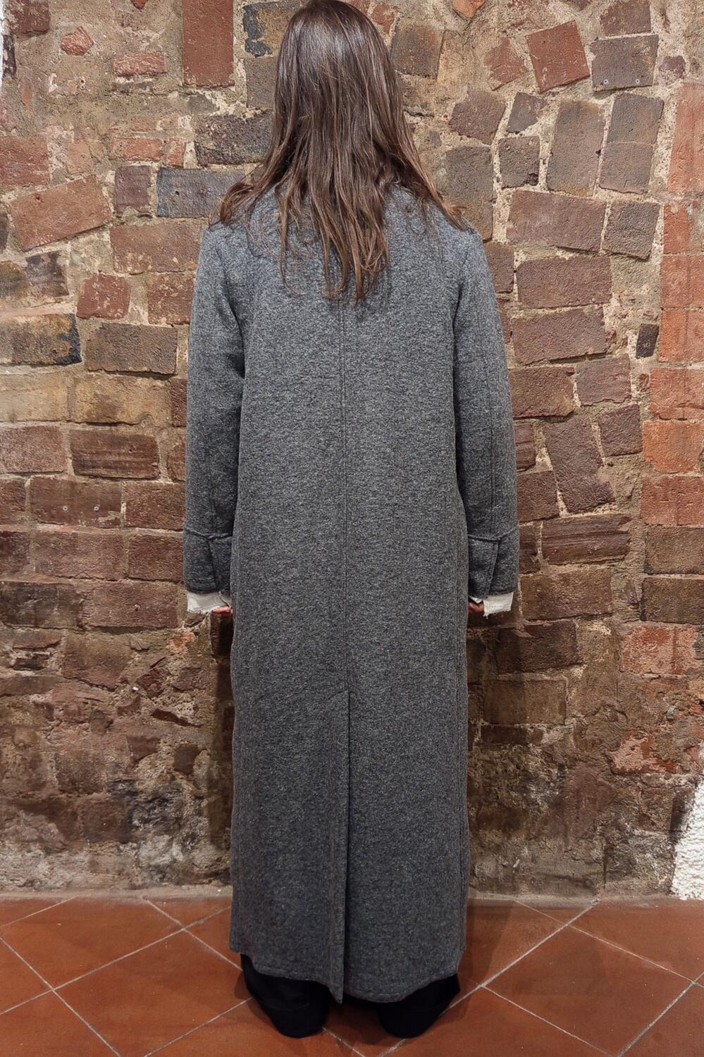 Long Coat colore grigio, in caldo e morbido tessuto, con maxi tasche applicate, inserti effetto camicia sui polsi, allacciatura con bottoni a clip in metallo nichelfree, spacco centrale posteriore, Finiture doppiate a taglio vivo.