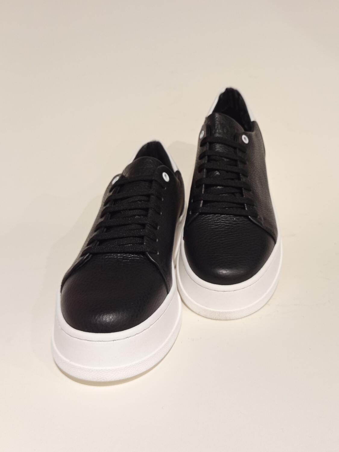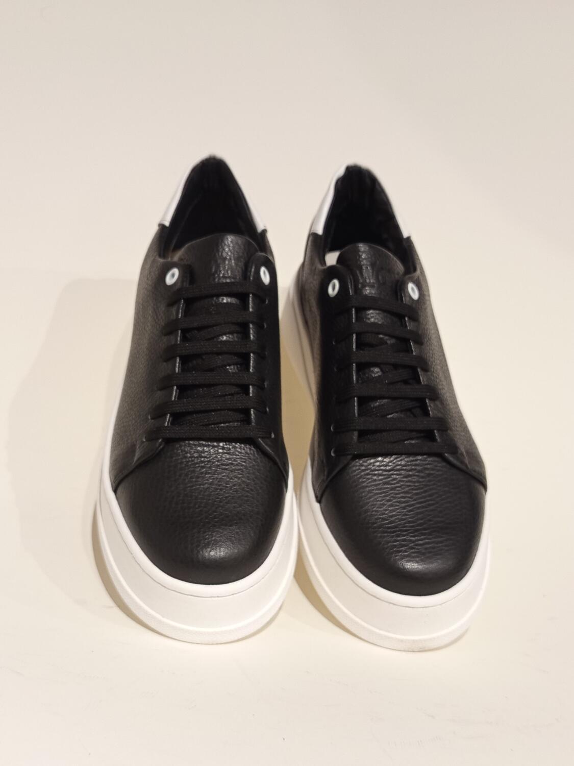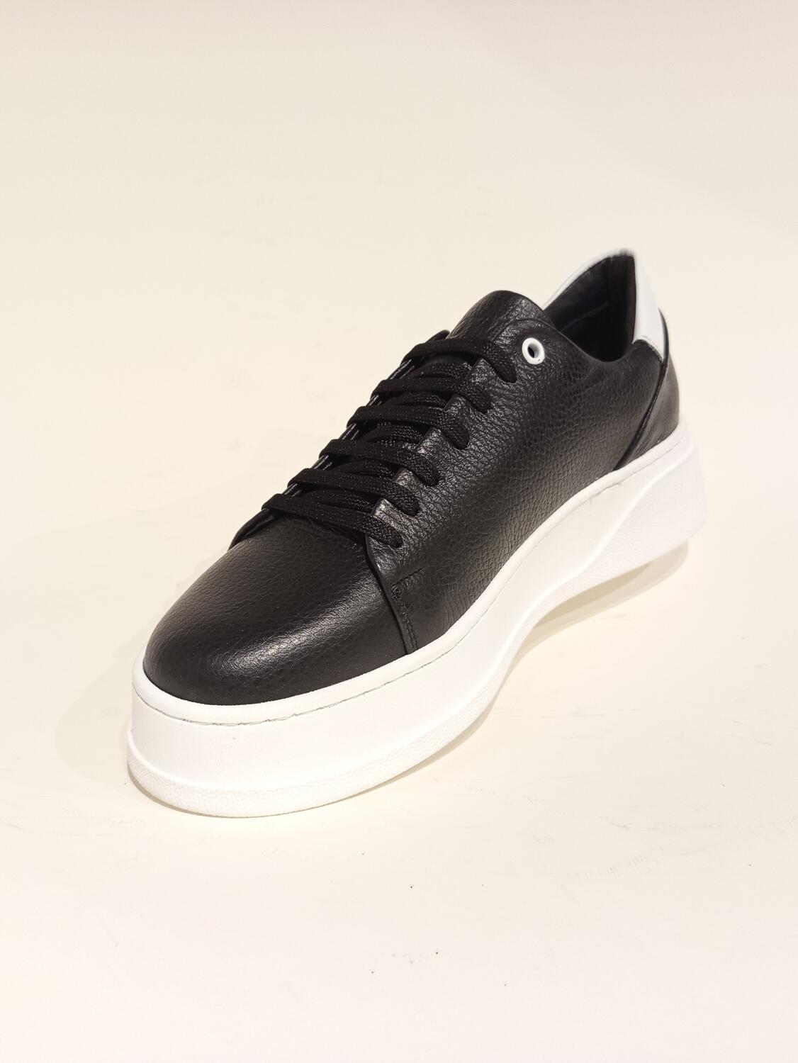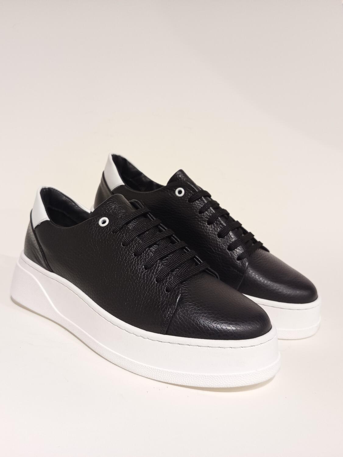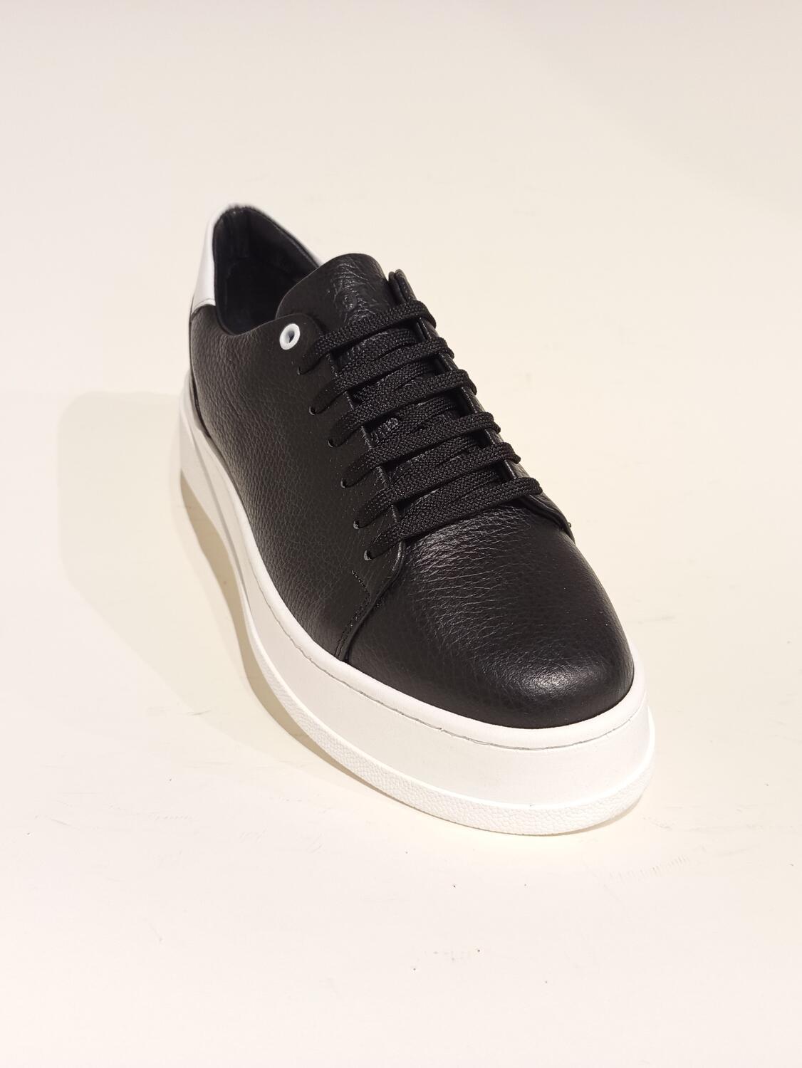 Sneachers stringata in pelle bottalata colore nero, suola e inserto sul tallone bianco a contrasto. stringhe in cotone nero. All'interno soletta morbida rivestita in pelle.